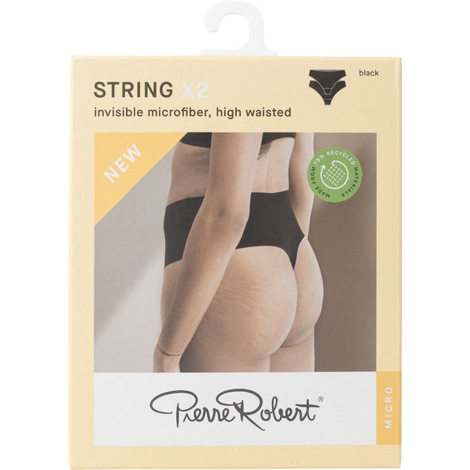 Pierre Robert Invisible Microfiber String er en ultra-tynd og højtaljet g-strengstrusse designet med laserskårne kanter for at undgå synlige syninger under tøjet. Den er fremstillet af en strækbar kvalitet med 75% genanvendt polyamid, hvilket sikrer både optimal bevægelsesfrihed og en behagelig pasform til hverdagen.