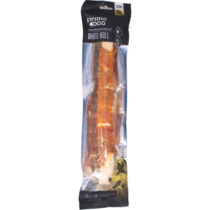 PrimaDog White Roll med kylling er et lækkert tyggeben af råhud omvundet med velsmagende kyllingekød, der vil begejstre de fleste hunde. Det aktiverer hunden og hjælper samtidig med at fremme en god mundhygiejne ved at give mekanisk modstand, når hunden tygger.