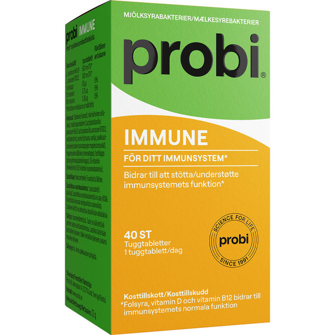 Probi Immune 40 Tyggetabletter er et kosttilskud med mælkesyrebakterier, der er sammensat til at støtte kroppens naturlige forsvar. De velsmagende tyggetabletter gør det nemt at supplere den daglige kost og vedligeholde en sund balance i immunsystemet.