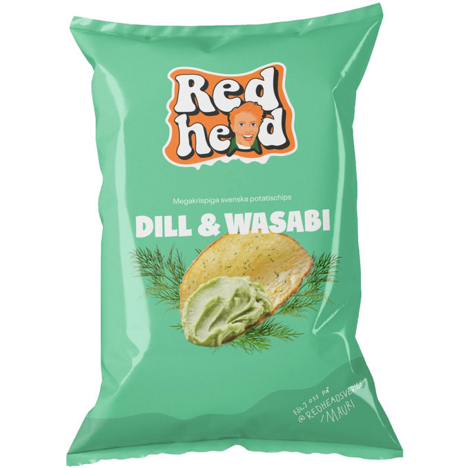 Redhead Chips Dild & Wasabi 150 g er sprøde kartoffelchips, der byder på en unik og dristig smagskombination af frisk dild og et intenst, varmt pift af wasabi. De er perfekte til at nyde en velsmagende og overraskende snack, der forener det nordiske med det asiatiske køkken.