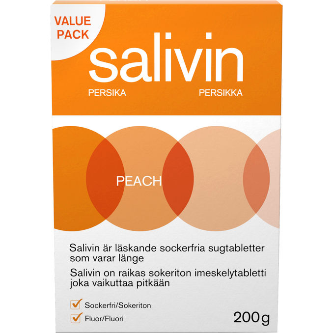 Salivin Peach er forfriskende sukkerfri pastiller, der holder længe med ferskensmag. Salivin tages mod mundtørhed og indeholder æblesyre og 0,05 mg fluor pr. sugetablet, som forebygger caries. Udviklet i samarbejde med tandlæger.