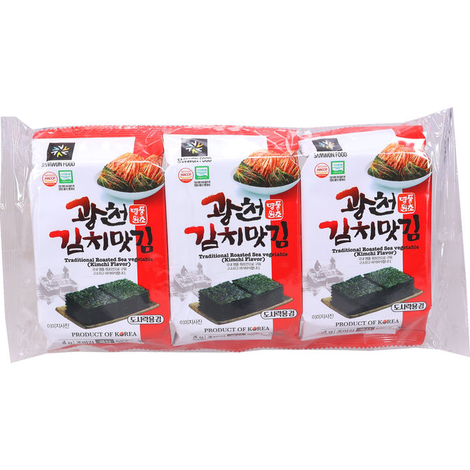 Samwon Food Roasted Sea Vegetable med kimchi-smag er en sprød koreansk tangsnack, der forener havets salte noter med et krydret spark fra kimchi. Pakken indeholder tre individuelle portioner, der er ideelle som en sund snack eller som et smagfuldt tilbehør til risretter.