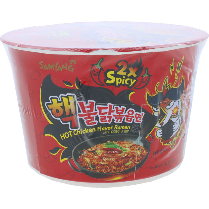 Samyang Buldak Ramen Hot Chicken 2x Spicy 105 g er yderst stærke instant nudler, der byder på den dobbelte intensitet af den populære hot chicken smag. De er perfekte til dem, der elsker en uovertruffen krydret udfordring og ønsker en velsmagende og hurtig nudelret, der garanteret varmer.