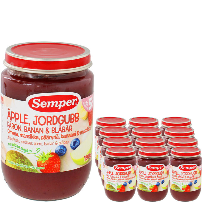 Puré med jordbær, æble, pære, banan og blåbær byder på en dejlig blanding af sommerlige smage. Den er perfekt som snack eller topping på grød og kan serveres på tallerken til sketræning eller direkte fra krukken.