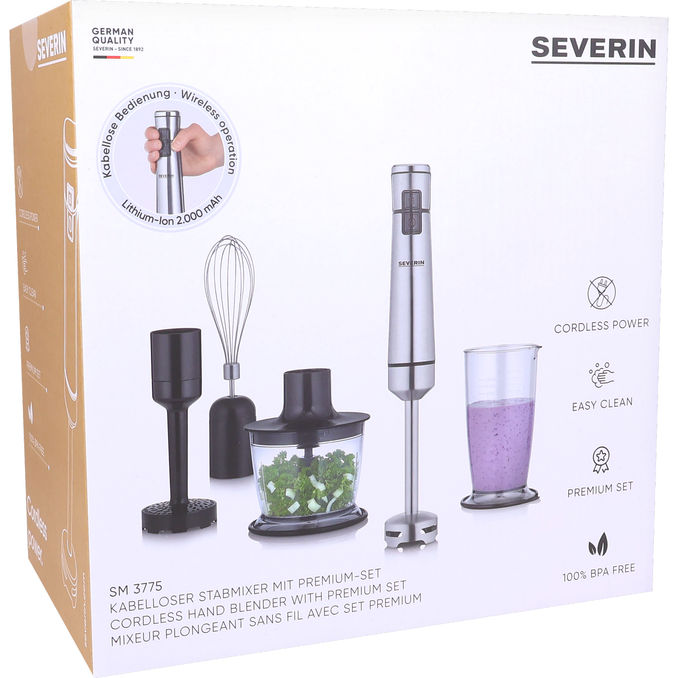 Severin SM 3775 Cordless Hand Blender Premium Set er en ledningsfri stavblender, der giver fuld bevægelsesfrihed og fleksibilitet i køkkenet. Det omfattende sæt inkluderer praktisk tilbehør som piskeris, minihakker og målebæger, hvilket gør det nemt at tilberede alt fra supper til smoothies uden besvær.