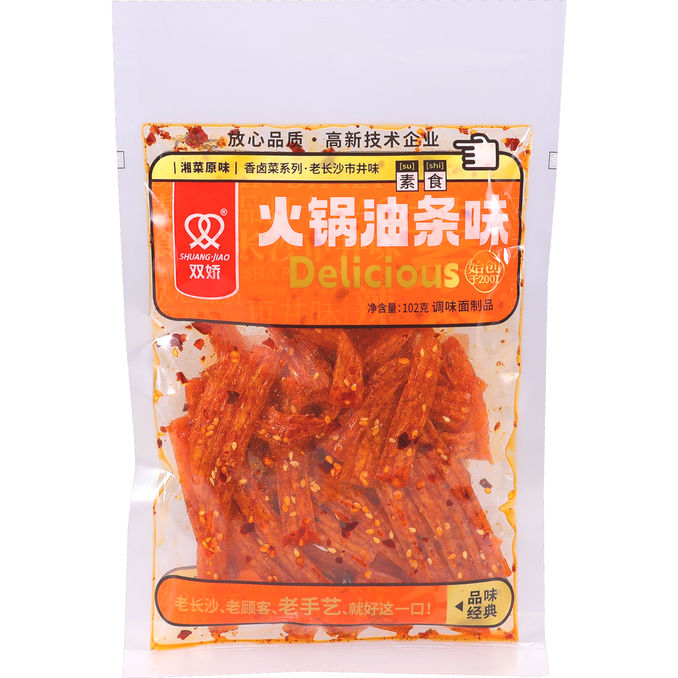 Shuang Jiao Hotpot Sticks er en stærk og aromatisk kinesisk snack med en sej tekstur, der er inspireret af de klassiske smage fra hotpot. De hvedebaserede sticks er rige på krydderier, chili og sesamfrø, hvilket giver en intens og krydret smagsoplevelse, der er perfekt til dem, der elsker autentiske asiatiske snacks med masser af power.