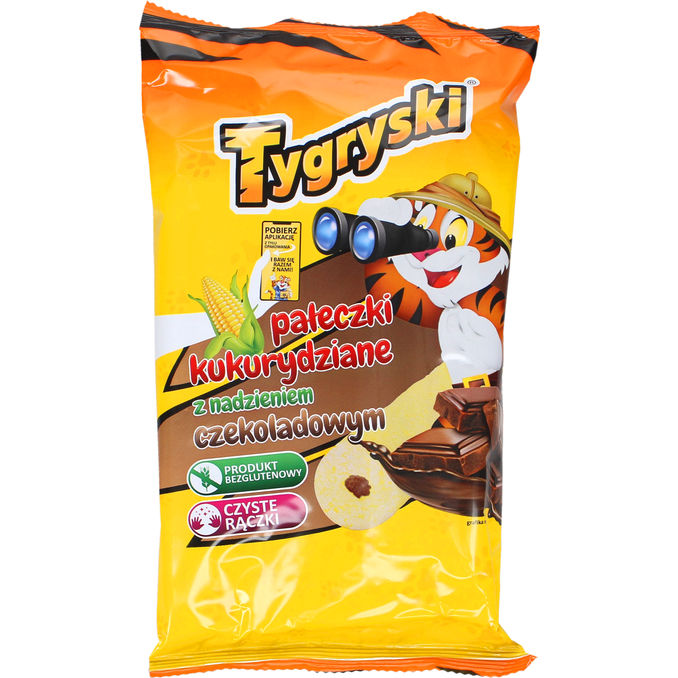 Tygryski Majssnacks med Kakaofyld er sprøde og luftige majsrør, der indeholder et blødt og sødt fyld med smag af kakao. Snacken er glutenfri og lavet uden palmeolie, hvilket gør den til et populært valg som en lille godbid. Den kombinerer den lette tekstur fra majsen med en intens chokoladesmag i hver bid.
