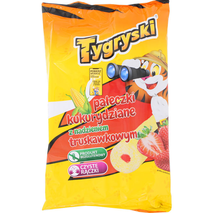 Tygryski Majssnacks med Jordbærfyld er sprøde, luftige majsrør fyldt med en sød creme med smag af jordbær. Disse snacks er glutenfri og fremstillet uden brug af palmeolie, hvilket gør dem til et populært valg til børn. Kombinationen af den lette majstekstur og det frugtige fyld giver en sprød og smagfuld snackoplevelse.