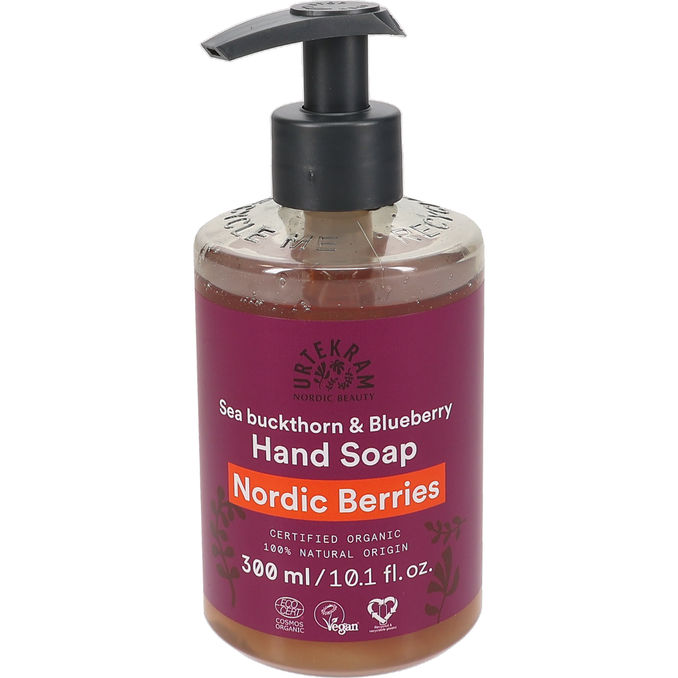 Urtekram Nordic Berries Hand Soap er en plejende og fugtgivende håndsæbe, der udnytter kraften fra nordiske superbær som havtorn og blåbær. Med sit indhold af hyaluronsyre og naturlige olier renser den hænderne effektivt uden at udtørre huden, mens den efterlader en mild og forfriskende duft af vilde bær.