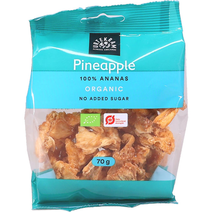 Urtekram Øko Tørret Ananas 70 g er økologiske ananasstykker, der er tørret skånsomt for at bevare deres naturlige sødme og eksotiske aroma. Den praktiske pose indeholder seje, smagfulde bidder, der fungerer perfekt som en sund snack eller som et tropisk pift i din morgenmad og bagværk.