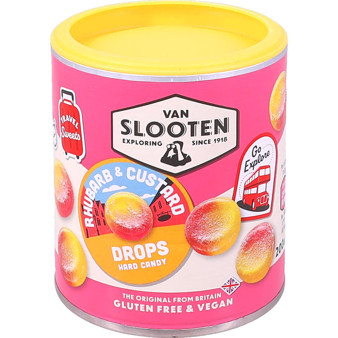Van Slooten Rhubarb & Custard Drops 200 g er klassiske, hårde bolsjer med en harmonisk kombination af syrlig rabarber og sødmefuld vaniljecreme. De leveres i en praktisk og dekorativ metaldåse, der bevarer den friske smag og gør dem nemme at have stående i bilen eller derhjemme.
