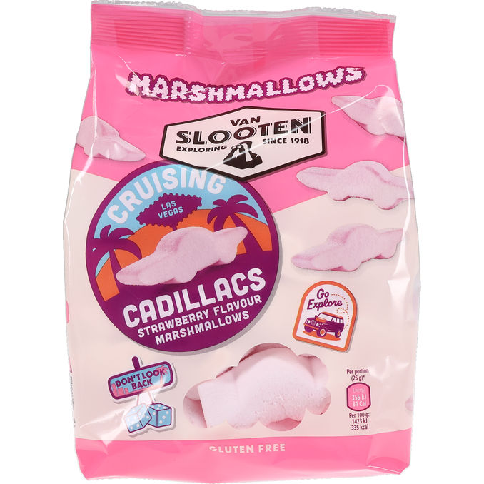 Van Slooten Cruising Cadillacs Marshmallows Jordbærsmag 250 g er bløde og luftige skumfiduser formet som klassiske Cadillacs, der byder på en sød og frugtig jordbærsmag. De er perfekte til at sprede glæde som en sjov snack, til at pynte desserter eller til at riste over et bål for en hyggelig stund.