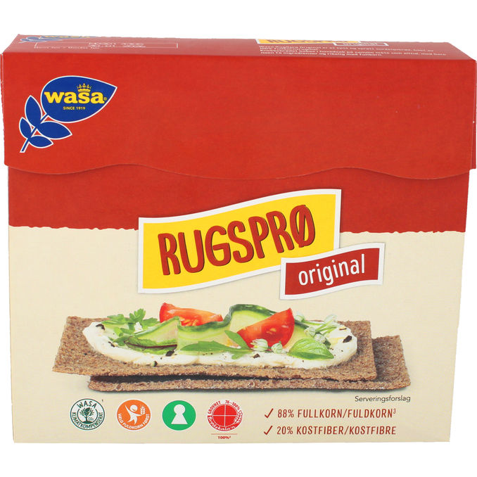 Wasa Rugsprø Original er et knækbrød bagt af 100 % fuldkornsrug, hvilket giver det en rustik og fyldig smag. Det er bagt med surdej og indeholder masser af fibre, hvilket gør det til et mættende og sundt valg til morgenmad eller som en let snack.