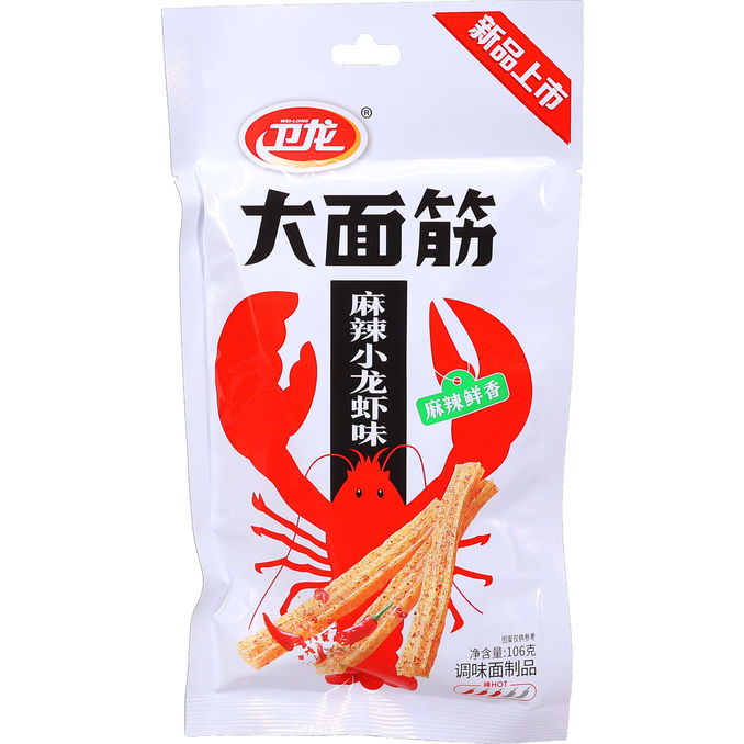 Wei-Long Gluten Snack med krebssmag er en populær kinesisk snack (latiao), der er kendt for sin seje tekstur og krydrede profil. Disse hvedebaserede sticks er smagt til med chili, spidskommen og aromatiske krydderier, der giver en intens og stærk smagsoplevelse inspireret af krydrede krebs.