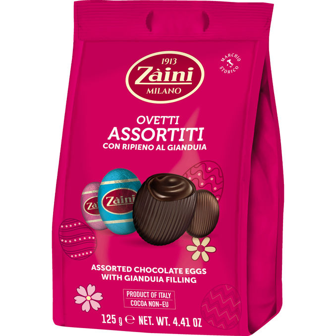 Zaini Chokoladeæg er en lækker pose med assorterede chokoladeæg fyldt med blød og cremet gianduia-nøddecreme. Posen på 125 g er perfekt som en sød påskehilsen eller til at dele i hyggestunder med venner og familie.