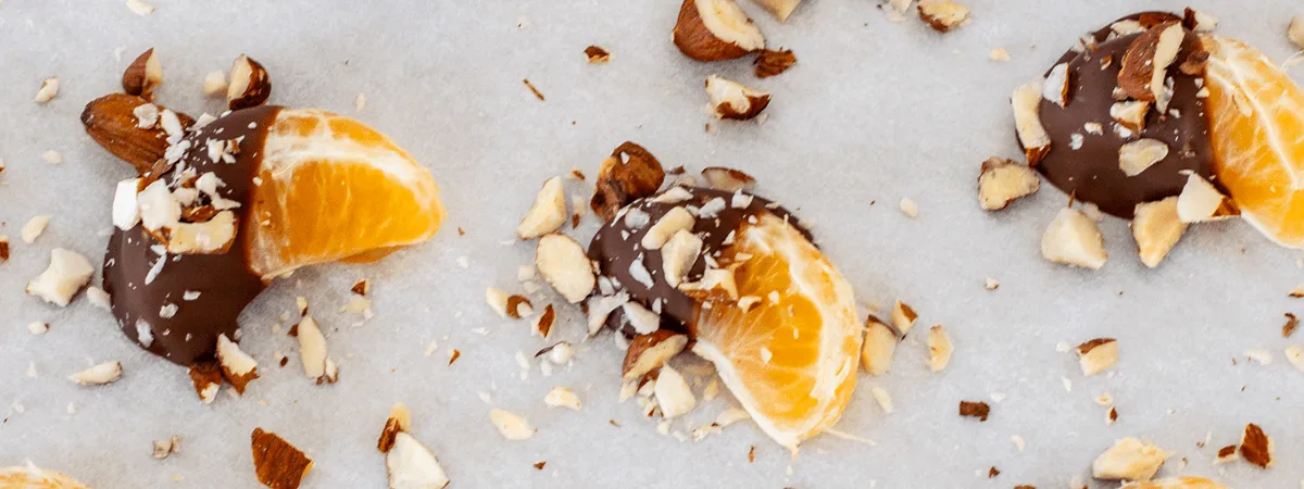Smelt chokolade og dyp den ende af enten mandarin, klementin eller appelsin både i chokoladen. Hak nødder fint og drys ovenpå. Lad chokoladen sætte sig på køl. Server til julehyggen 🍊🎄